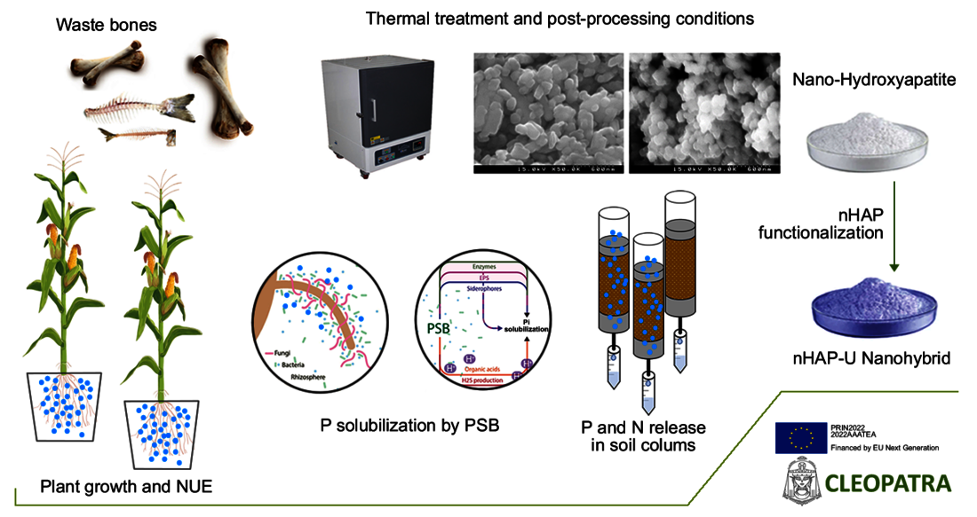 Il progetto CLEOPATRA (“Economia circolare e agricoltura sostenibile: idrossiapatite da rifiuti organici come nanofertilizzante intelligente”), finanziato dal bando MUR-PRIN 2022, riguarda il potenziale della nanoidrossiapatite derivata da rifiuti organici e dei suoi nanoibridi risultanti come nanofertilizzante intelligente.